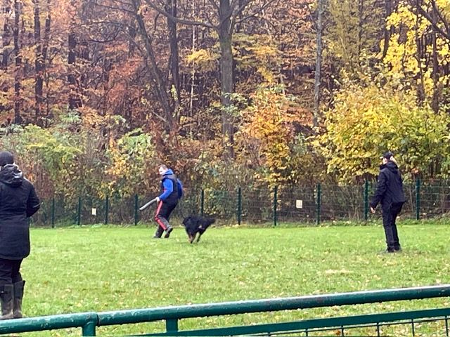 Die Gespenster laufen auf den Hund zu. Dabei muss der Hund vorne stehen bleiben und sollte angstfrei beobachten. Anschließend wird die Situation zusammen mit dem Hundeführer „aufgelöst“