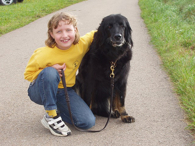 Delia war in jungen Jahren mit mir (Sabine) eine sehr erfolgreiche Leistungshündin. Sie hat 1998 als erste Hündin nach 26 Jahren mit einer Hundeführerin die DM im RZV für Hovawart-Hunde gewonnen, das Jahr darauf wurde sie Vierte und danach noch einmal in Hamburg Dritte.