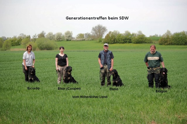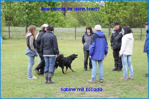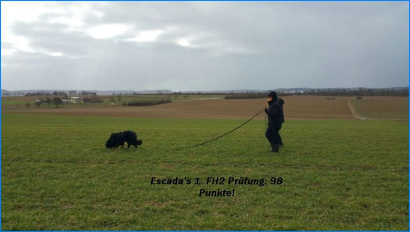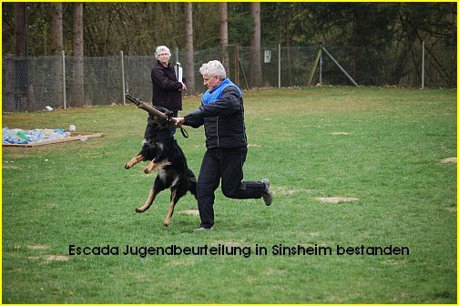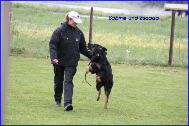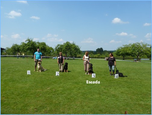 Escada und ihre Geschwister nahmen am 5. Mai 2012 mit nur 7 Monaten (damit waren sie die jüngsten Teilnehmer) an der NZB in Pfedelbach teil. Escada hat sich vorbildlich benommen und es wurde ihr ein temperamentvolles Wesen und ein ausgeprägter Beutetrieb attestiert.