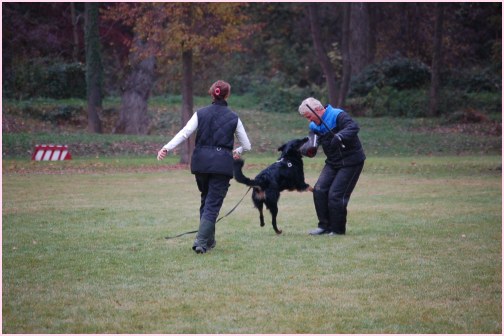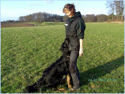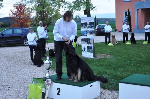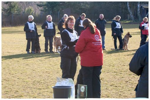 Hier musste Jana ihr ganzes Können aufbieten: Der Fährtenleger war in ziemlichen Schlangenlinien und in unmöglich hohes und zertrampeltes Gras (wo er nicht rein sollte) gelaufen, ebenso wusste er nicht, wo seine Gegenstände lagen. Auf dem vorletzten Schenkel lag zudem noch ein Hase auf dem Gegenstand (Beute?). Sabine konnte jedoch Bryana überzeugen, weiter zu suchen, sodass am Ende der 4. Platz und die Fahrkarte zur FH-DM rauskam!!
