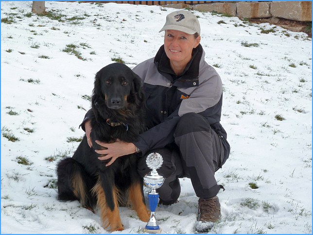 Am 21.- 23.02.14 fand die diesjährige Deutsche Fährtenhund Meisterschaft des Verbandes für das Deutsche Hundewesen (VdH) statt. Austragungsort war Stelle bei Hamburg. Der Traum eines jeden engagierten Hundeführers ist es, dort einmal starten zu dürfen, denn hier nehmen nur die besten ihres jeweiligen Rassezuchtvereins teil, d.h. das Teilnehmerfeld bestand unter anderem aus amtierenden Deutschen Meistern und Weltmeistern. Sabine Keßler vom Rassezuchtverein für Hovawart Hunde (RZV-H)konnte sich mit ihrer 5 Jahre alten, selbst gezogenen Hündin Bryana vom Hohenloher Land durch den 2. Platz bei der Deutschen FH Meisterschaft ihres Verbandes im Herbst 2013 qualifizieren. Das hieß nun für das Pfedelbacher Team den Winter hindurch fleißig weiter zu trainieren, um den Hund in Kondition zu halten.