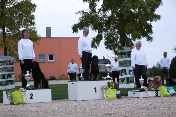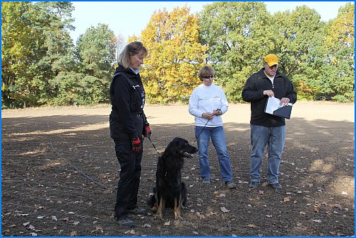 Am 20./21.10.12 trafen sich die 17 besten Hovawarte aus ganz Deutschland zur Fährtenhund-Prüfung in Sewekow an der Mecklenburgischen Seenplatte. Der goldene Oktober kündigte sich an und die Sonne meinte es noch mal richtig gut, was die Sucharbeit für die Hunde noch schwerer machte. Auf staubtrockenem Sandacker mit vielen Wildspuren mussten die Teams ihr ganzes Können zeigen. Sabine und Bryana losten ausgerechnet den Start um 12.00 Uhr in der größten Hitze. Dennoch suchte die erst 4 Jahre alte Hündin konzentriert die Fährte ab und wurde von dem, doch sehr streng richtenden Leistungsrichter, mit 87 Punkten belohnt. Das war zunächst für längere Zeit die Führung.