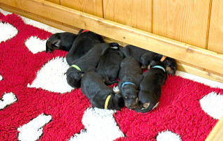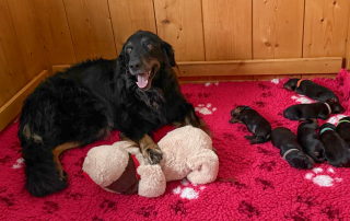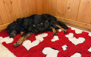Der I -Wurf vom Hohenloher Land ist am 16.3.26 geboren worden. 5 Rüden und 3 Hündinnen alle schwarzmarken. Sie sind wunderschön und topfit. Elea kümmert sich, wie immer, liebevoll um ihre Welpen...