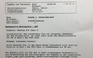 Wir haben gerade das Ergebnis für unsere Escada von Laboklin bekommen: Sie ist frei vom SOD1 Gen!! und zwar homozygot N/N. Somit kann sie diesen Hochrisikofaktor für DM nicht an ihre Nachkommen weitergeben! Wir freuen uns sehr. :)